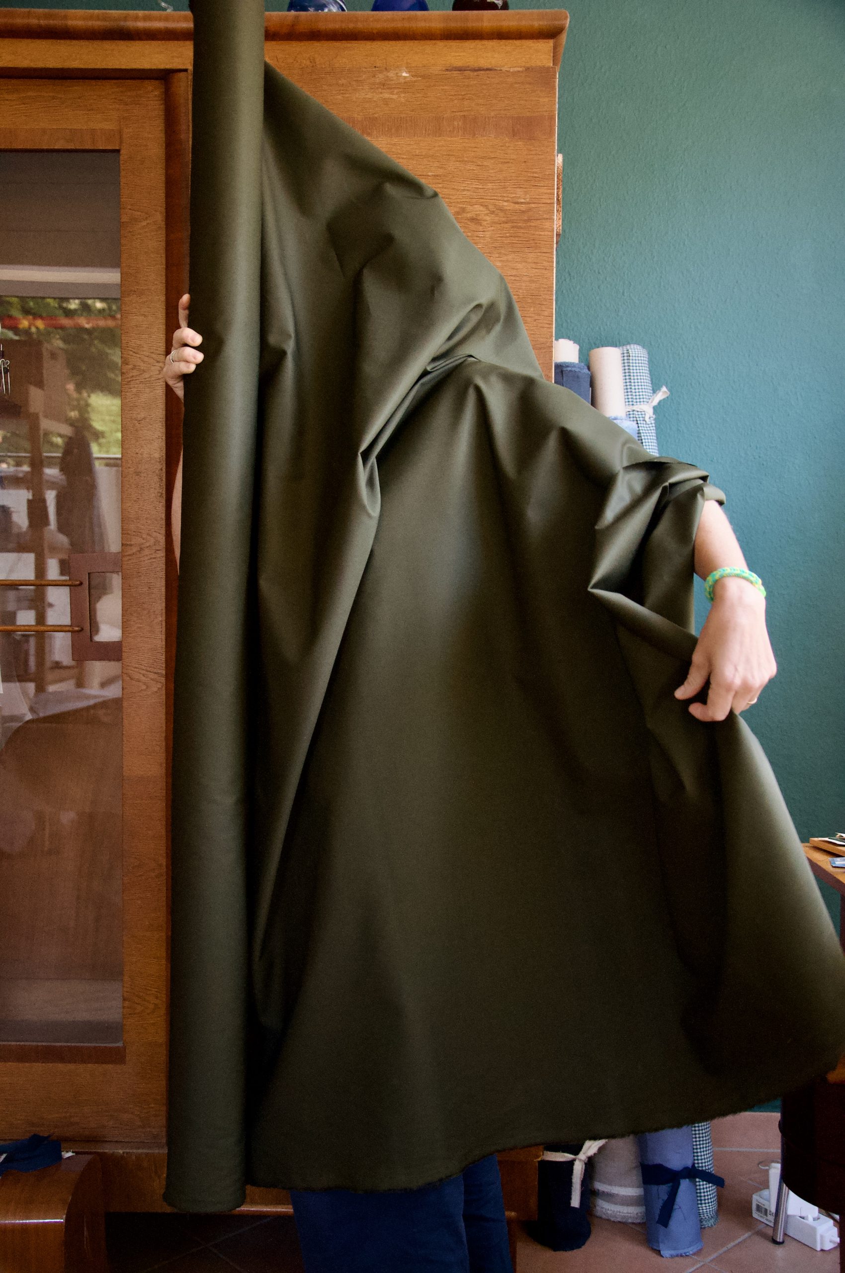 Fein gewebter Deadstock-Stoff aus 100 % Baumwolltwill in dunklem Olivgrün. Finely woven deadstock 100% cotton twill fabric in dark olive green.