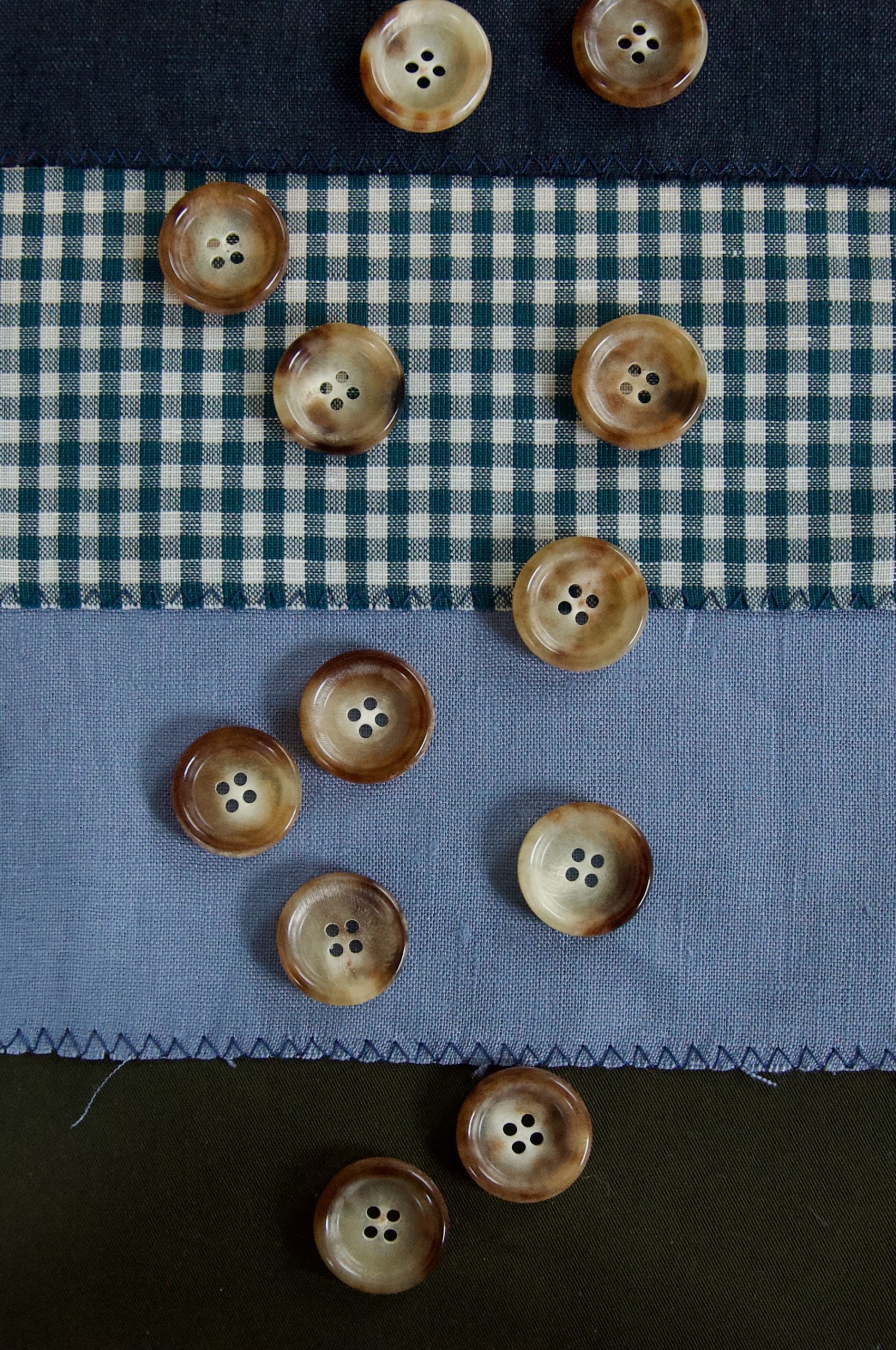 Buttons carved from natural, biodegradable, real horn, 20mm in diameter. Made in Germany. Like all products made from natural materials, there is some color variation, and no two buttons are exactly alike.