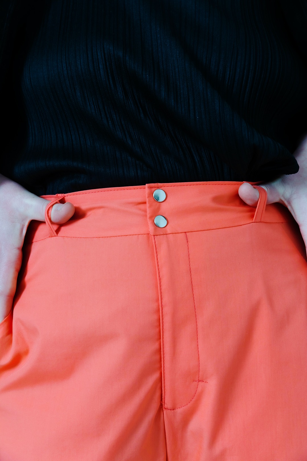 The coral red sample is made in “Pure Solids” poplin in the colour PE438 Coral Reef (100% cotton, 3.69 oz/125 gsm). The greenish sample with leg hem pleats is made in “Wildflover Wovens” in the colour WWOV2013 Slub in Prickly Pear (100% cotton, 3.69 oz/125 gsm). Both fabrics are by Art Gallery Fabrics.