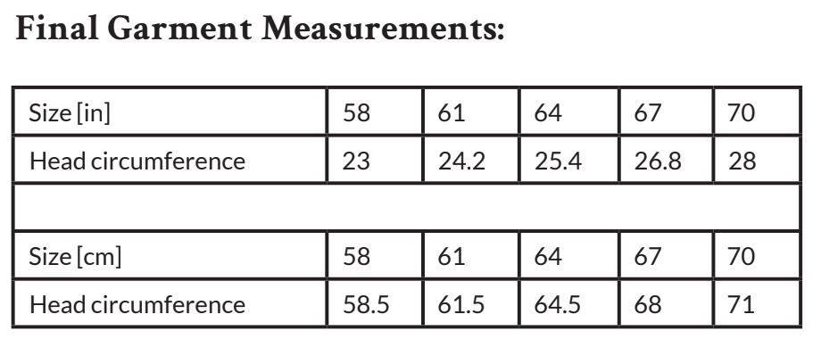 Sizes 58 (61, 64) (67, 70): Choose your size based on your head circumference. Add a recommended positive ease of 1.2–1.9″/3–5 cm. Pick the size that is the best match for your head.