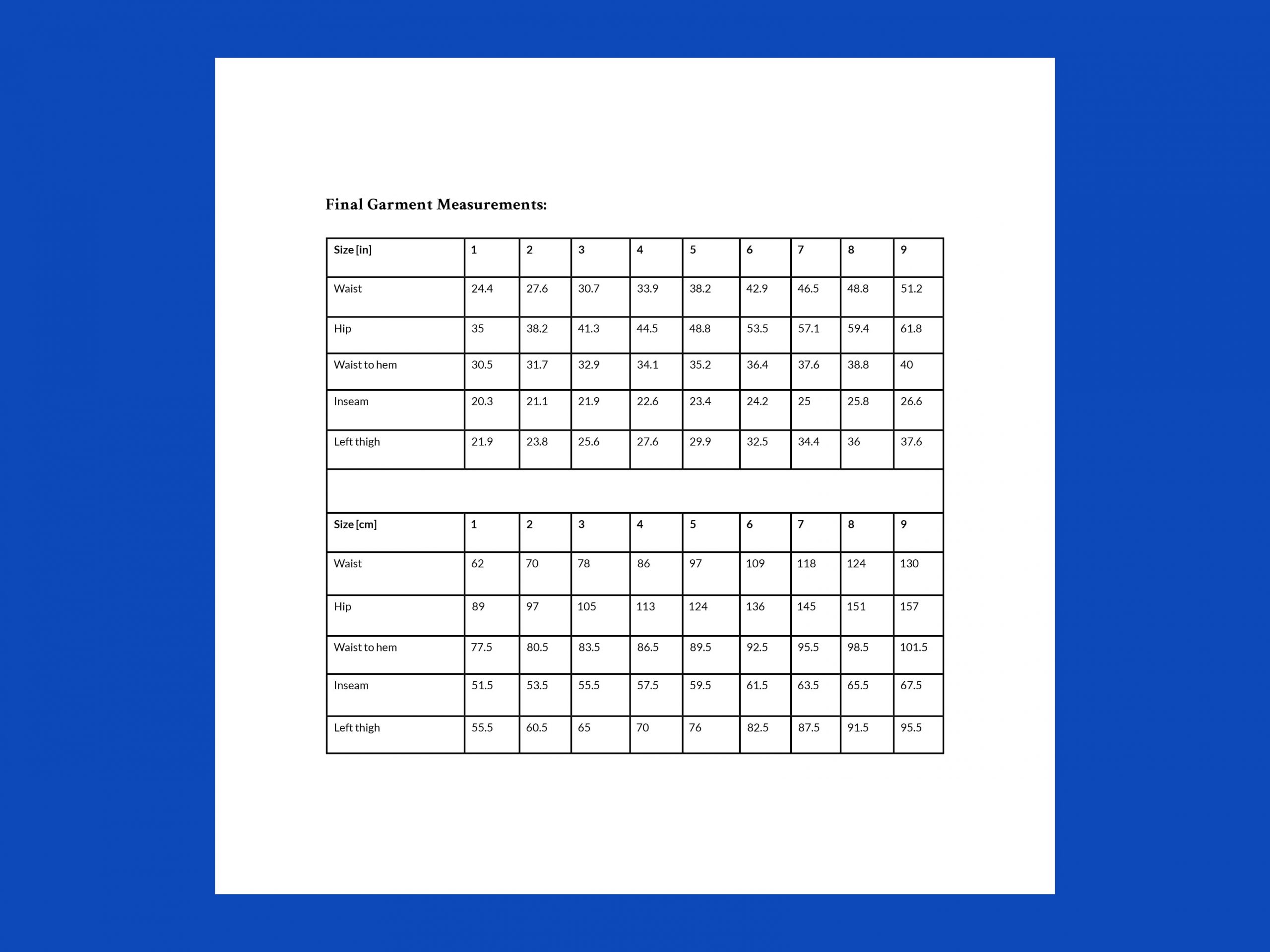 Choose your size based on your waist circumference. Add a recommended positive ease of approximately 1.2–2″/3–5 cm. Make sure that the fullest part of your left thigh fits into the leg.