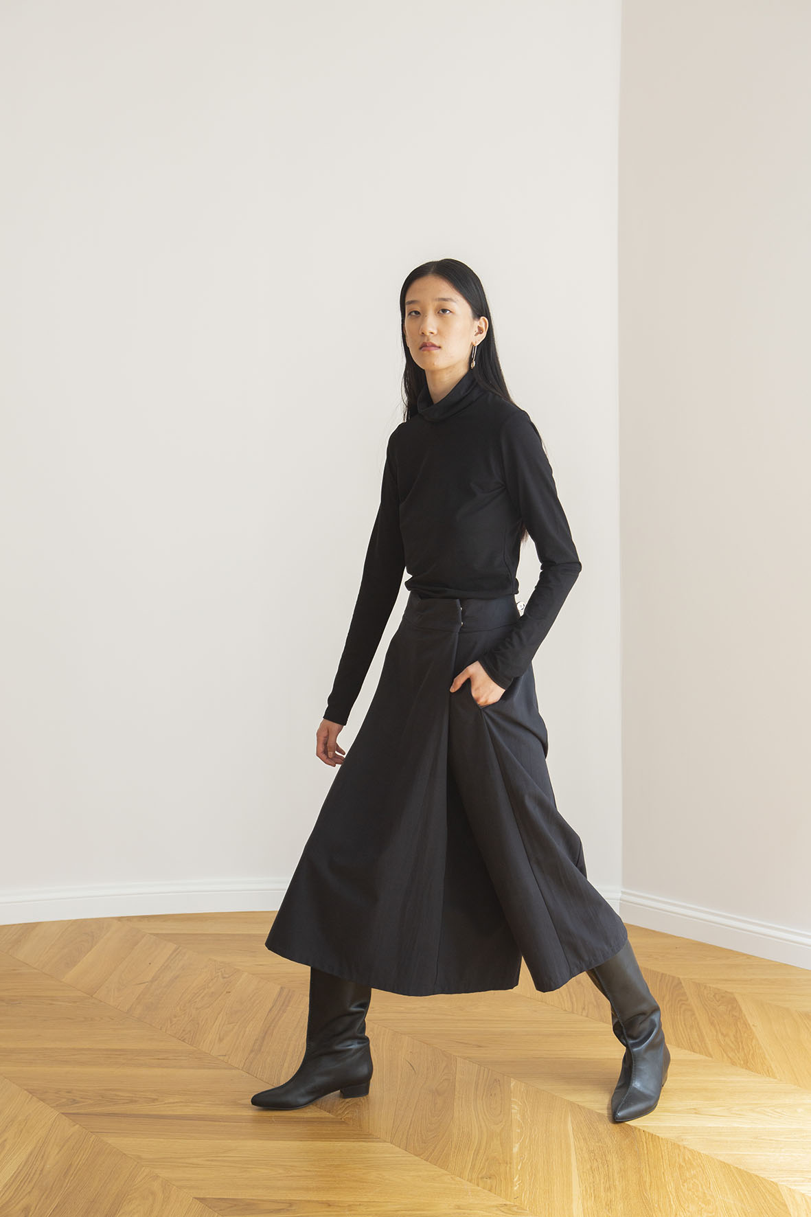 The LUCE trousers are distinctive, asymmetrical trousers with a wide skirt-like hem. They have practical pockets at the side seams and a press-button closure at the waist.