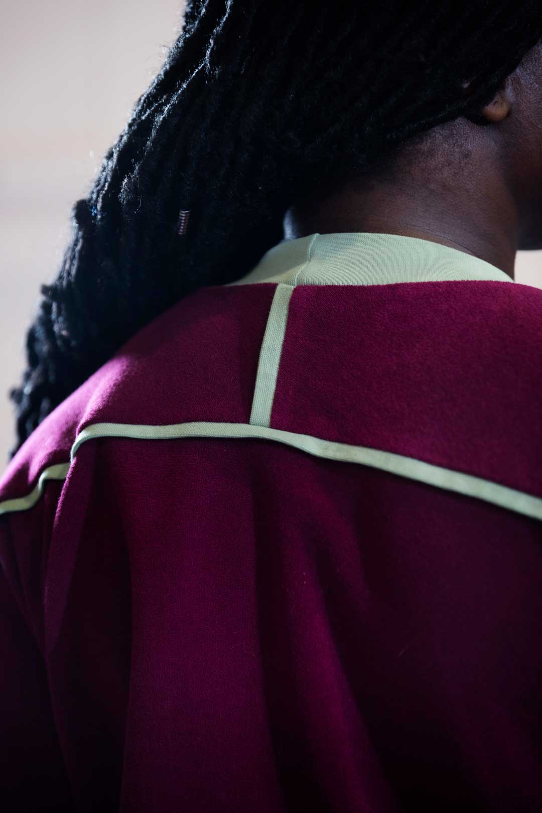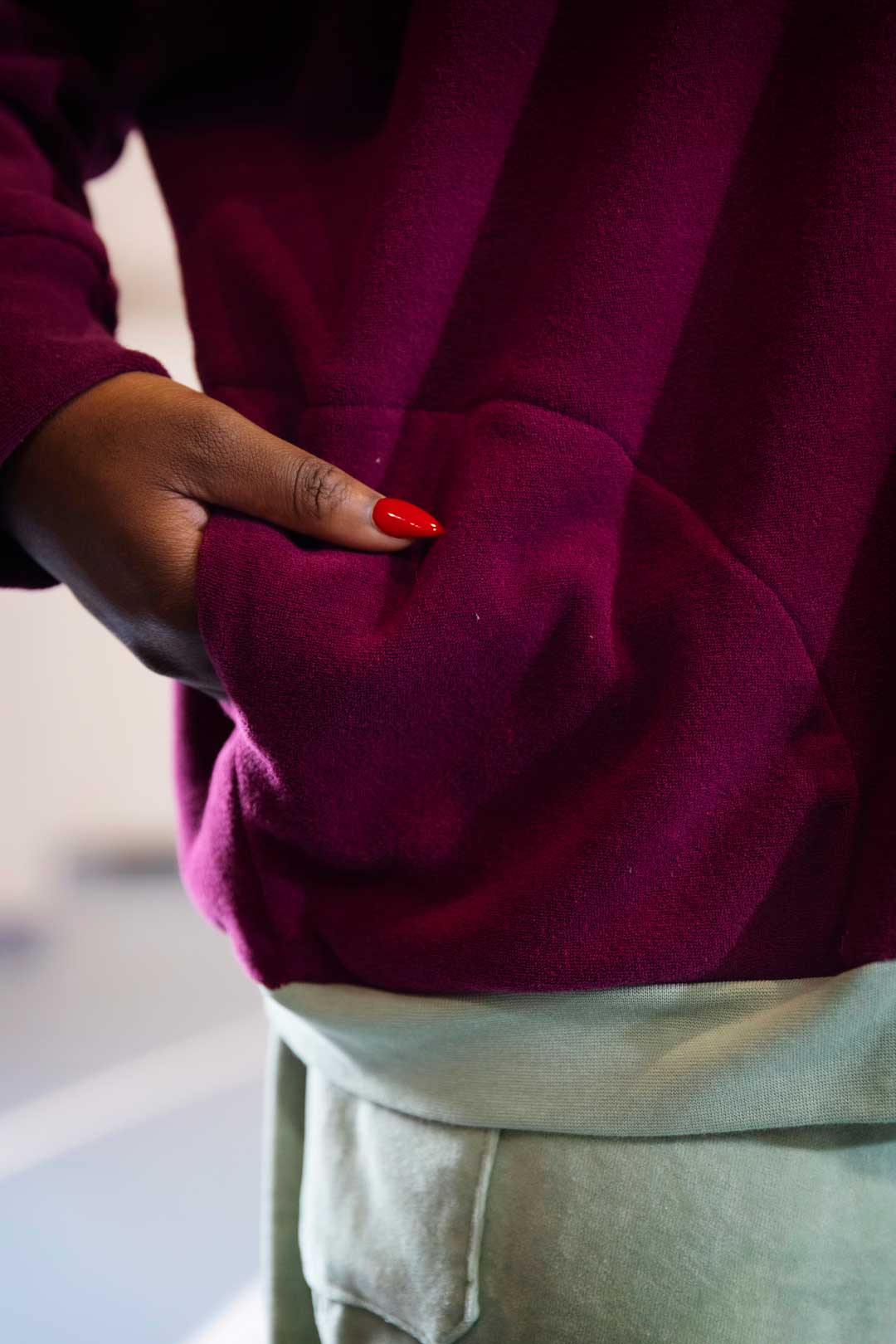 Choose medium to heavy-weight knits or jerseys for sporty and activewear versions. Use plush fabric for greater comfort and warmth. To create a casual look, choose a medium-weight linen. Choose double gauze for a cosy feel and draping fabrics such as silk or Tencel for an elegant look. The green sample is made in “Unbrushed Organic Cotton Sweat” in shades of green (100% organic cotton, 9.73 oz/330 gsm) and the purple sample is made in “Brushed Terry GOTS Organic Cotton Purple Potion” (100% organic cotton, 8.55 oz/290 gsm). The neckline rib and the bias binding are made using “Rib 1×1 stretch GOTS Organic Cotton”. All fabrics by Ecological Textiles.