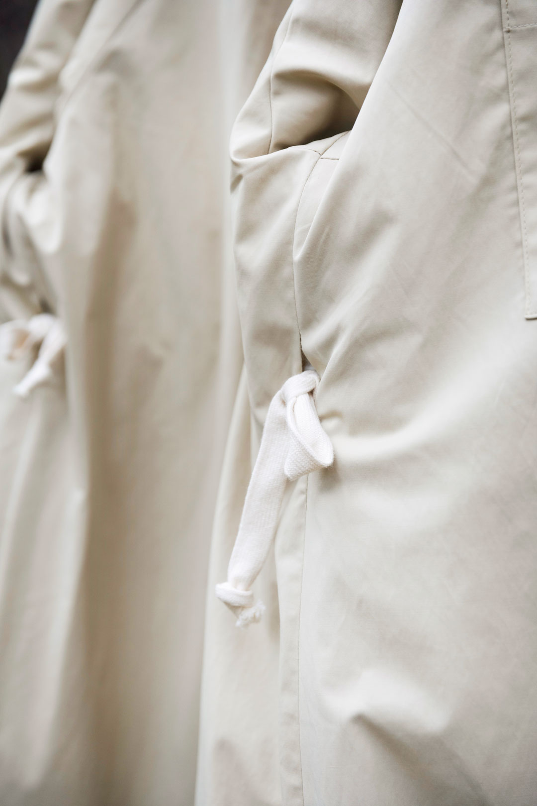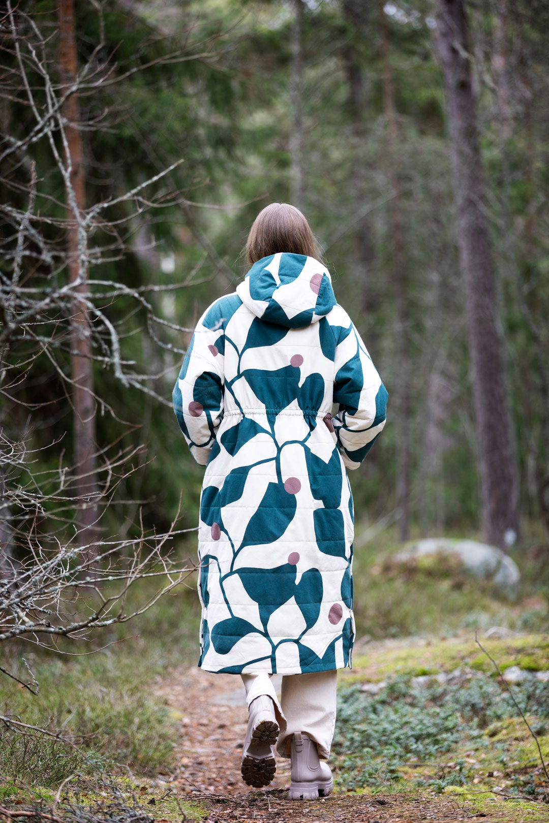 The sample coat is made in “Leafly Bold Bottle Green Canvas” (100% cotton, 11.80 oz/400 gsm) by METERMETER. The wool fleece batting (85% new wool, 15% polyester, 5.3 oz/180 gsm) is by Ecological Textiles and the lining is from the designer’s stash. For the coat drawstring, we used 0.6″/1.5 cm wide natural tubular ribbon (100% organic cotton) by Ecological Textiles. The jacket version is made in dark green water-repellent canvas (100% organic cotton, 8.9 oz/300 gsm) by Ecological Textiles. The zippers are by METERMETER.