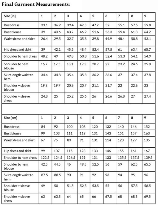 For the AURELIA dress and skirt, choose your size based on your waist circumference. Add a recommended positive ease of 1.2–2″/3–5 cm. Pick the size that is the best match for your waist. For the AURELIA blouse, choose your size based on your bust circumference. Add a recommended positive ease of 5.9–8.5″/15–22 cm. Pick the size that is the best match for your bust.