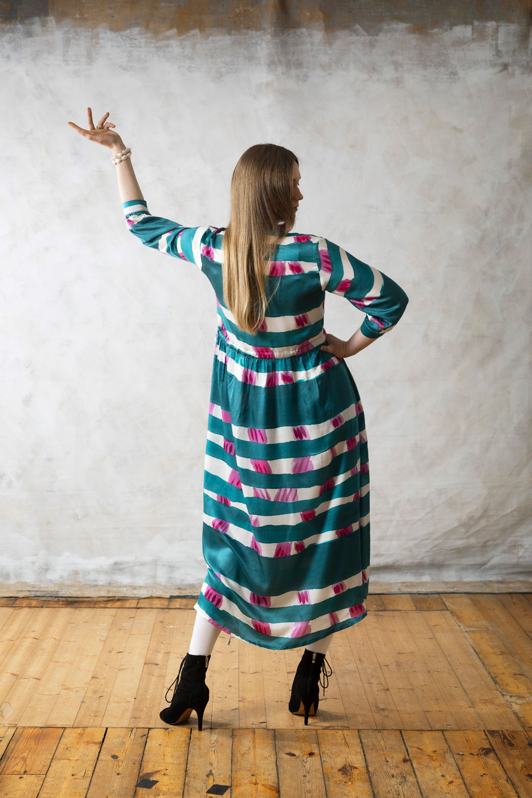 DYNAMO can be adapted to different types of woven and non-stretch fabrics.Choose fabrics such as cotton, linen, satin, silk, or viscose from 1.77 oz/60 gsm to 6.34 oz/180 gsm. The printed dress sample is made in silk satin fabric with turquoise, white, and pink stripes (68% silk, 32% viscose, 1.77oz/60 gsm) by Sacres Coupons. The green dress sample with crimson red detail is made in “Organic Papertouch Poplin” (100% cotton, 4.23 oz/120 gsm) by METERMETER.